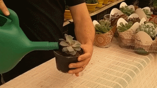O meio mais tradicional é molhara echeveria com um regador, de preferência o regador de bico fino. Molhe por baixo das folhas, já que as folhas da echeveria mancham quando são molhadas. Quando o substrato está bem seco, ele “chupa” bem a água, e é muito fácil molhar as echeverias. Se a água transborda com facilidade, o substrato pode estar úmido ainda.