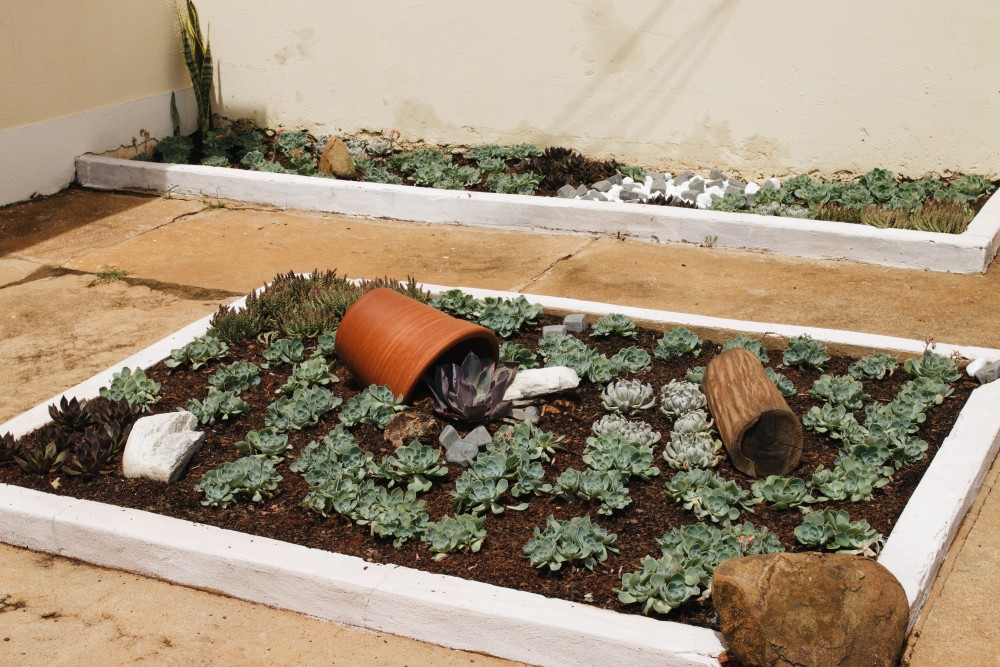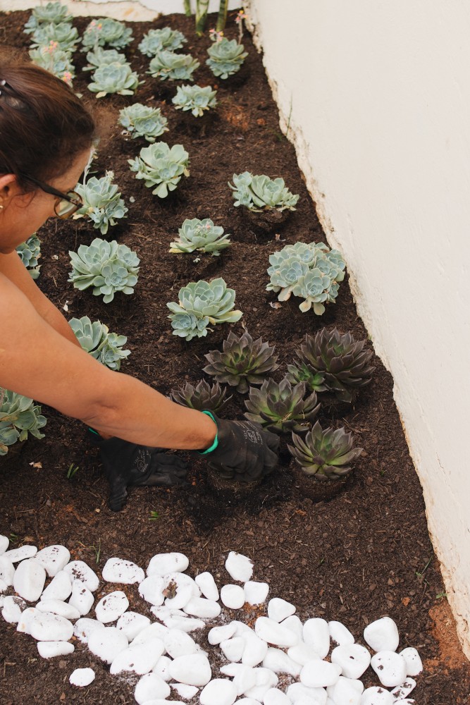 Lembre-se que echeverias crescem e podem atingir até 30cm de diâmetro, ou mais em algumas variedades. Faça o canteiro com espaço entre as mudas e deixe que cresçam, dominando o espaço aos poucos! Você também pode ir plantando mudinhas novas nos espaços mais vazios, nada melhor do que ver um canteiro desses ganhar vida com o passar do tempo!