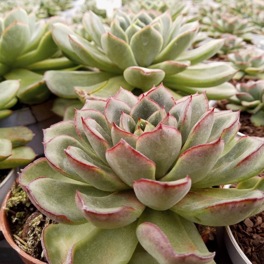 As echeverias são plantas que mudam de cor dependendo da incidência de luz e de hidratação! Nesta foto temos à frente uma Echeveria Gilva bem seca, e logo atrás uma hidratada. Mais seca, ela vai adquirindo uma borda avermelhada semelhante à Echeveria Pulidonis!