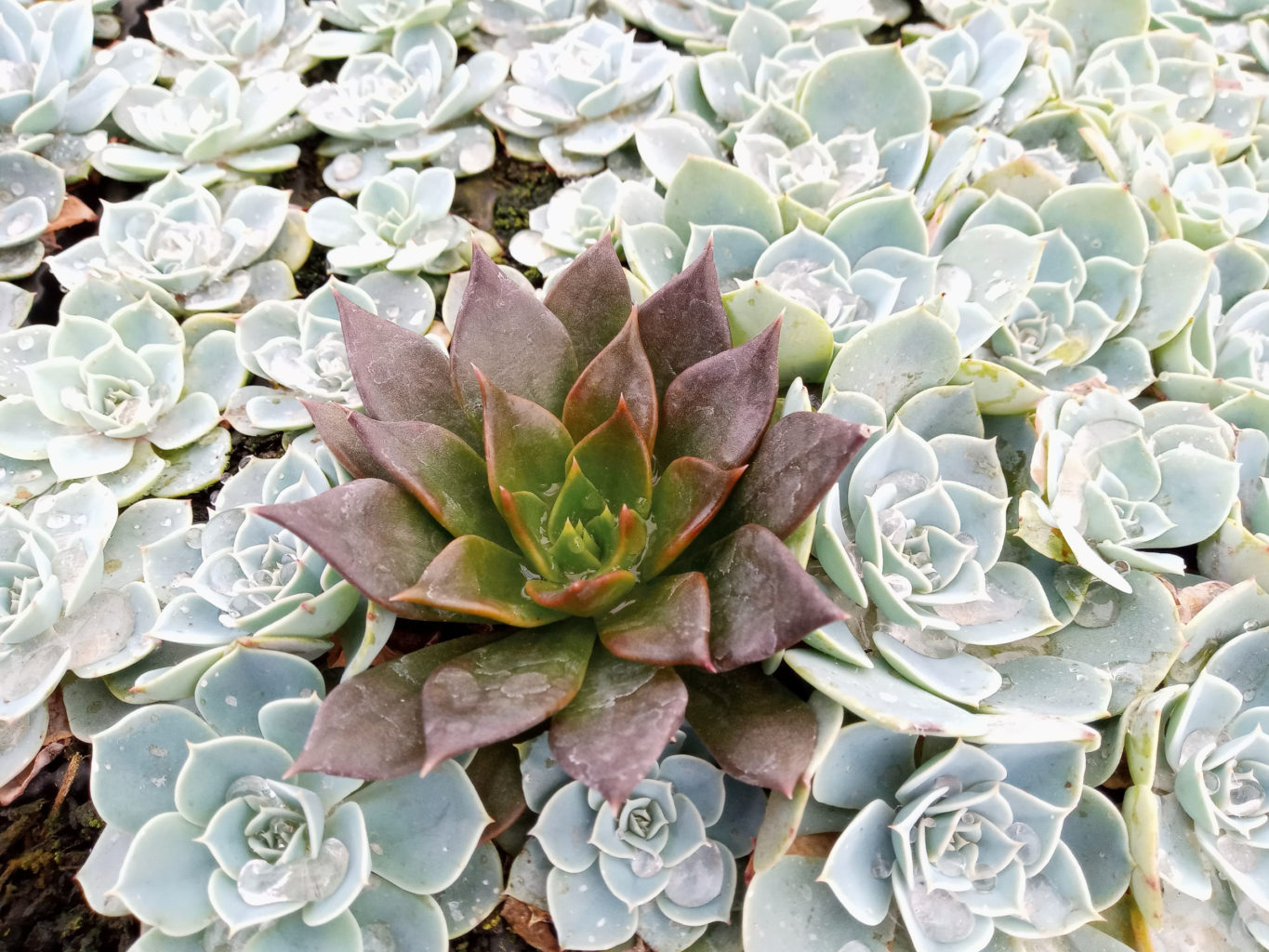 Às vezes uma muda acaba parando na bandeja errada, como essa echeveria Hot Chocolat no meio da Peacok. Mas o efeito é incrível!